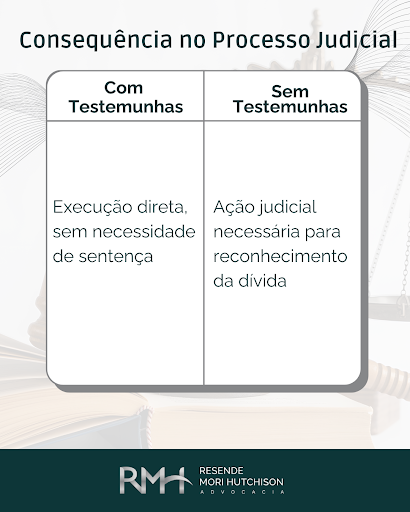 O artigo 784, III, do Código de Processo Civil estabelece que o contrato assinado por duas testemunhas tem força de título executivo extrajudicial. Isso permite que, em caso de descumprimento, o credor ingresse diretamente com ação de execução, sem precisar de um processo de conhecimento.