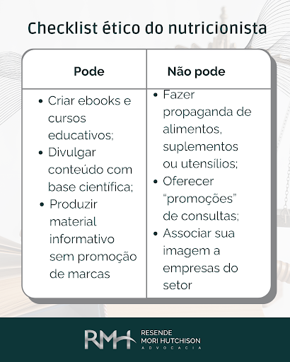 A principal regra é manter a independência profissional. O nutricionista não pode associar sua imagem a marcas comerciais, nem fazer propaganda de alimentos, suplementos, fitoterápicos ou utensílios de cozinha.